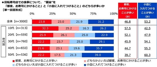 世代別にみると、『小皿に入れてつけることが多い(計)』の割合は、年代が上がるにつれて高くなる傾向がみられました。