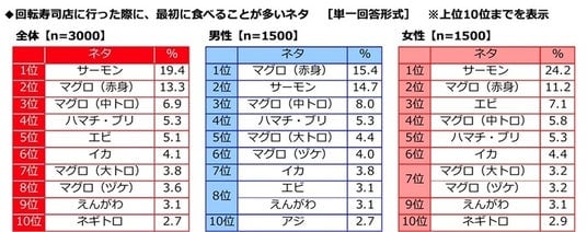 男女別にみると、男性では1位「マグロ(赤身)」(15.4%)、2位「サーモン」(14.7%)、3位「マグロ(中トロ)」(8.0%)、女性では1位「サーモン」(24.2%)、2位「マグロ(赤身)」(11.2%)、3位「エビ」(7.1%)となりました。