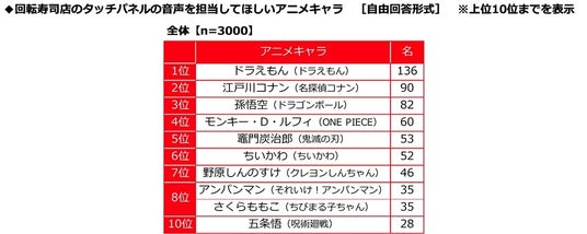 また、回転寿司店のタッチパネルの音声を担当してほしいアニメキャラを聞いたところ、1位「ドラえもん-ドラえもん-」(136名)、2位「江戸川コナン-名探偵コナン-」(90名)、3位「孫悟空-ドラゴンボール-」(82名)、4位「モンキー・D・ルフィ-ONE PIECE-」(60名)、5位「竈門炭治郎-鬼滅の刃-」(53名)となりました。