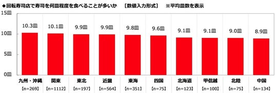 エリア別にみると、食べる皿数が最も多かったのは九州・沖縄(10.3皿)、次いで関東(10.1皿)、東北と近畿(いずれも9.9皿)が続きました。