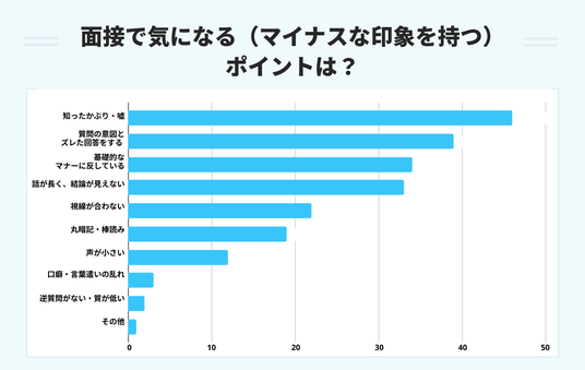 「面接でマイナスな印象を持つポイント」のワースト1位は「知ったかぶり・嘘(64.8%)」、次いで「質問の意図とズレた回答をする(54.9%)」という結果になりました。社会人としての「基礎的なマナー違反(47.9%)」も上位に入りましたが、それ以上に「自分を実態以上に良く見せようとする不誠実な態度」や「対話のズレ」が厳しく評価を落とす要因となっています。