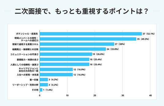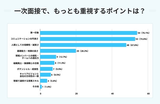 一次面接では「第一印象(76.1%)」「コミュニケーションの円滑さ(74.6%)」など基礎的な対話力が重視されるのに対し、二次面接では「ポテンシャル・成長性(52.1%)」「現場メンバーとの相性(49.3%)」といった実務や組織への適性へとシフトします。