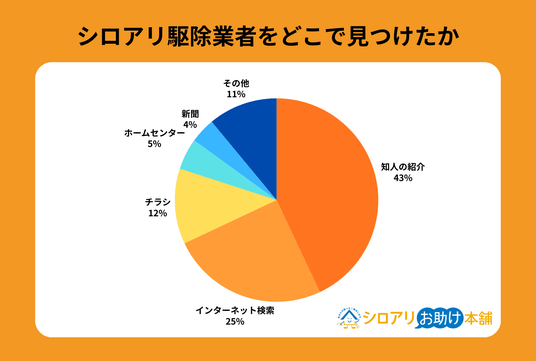 調査結果によると、シロアリ駆除業者を見つけた方法でもっとも多かったのは「知人の紹介」で43%でした。次いで「インターネット検索」が25%、「チラシ」が12%という結果です。
