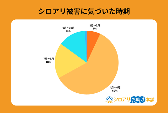 調査結果によれば、シロアリ被害に気づいた時期でもっとも多いのは4~6月で、検索トレンドのピークと一致しています。