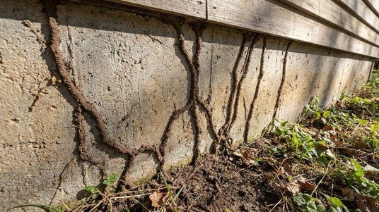 地面から木材に向かって伸びる蟻道