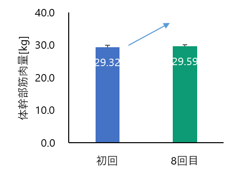 【調査結果2.】体幹筋肉量の増加また施術前後の体幹筋肉量を比較したところ、平均0.27kg増加し、有意な改善が認められました。筋肉は体の中で最も多くのエネルギーを消費する組織であり、筋肉量の増加は基礎代謝の向上にもつながります。筋肉量の回復が、代謝や症状スコアといった複数の指標に同時に良い変化をもたらした可能性があります。