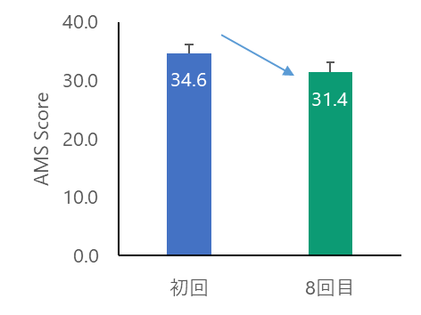 【調査結果1.】男性更年期症状スコア(AMSスコア)の改善その結果、初回の平均AMSスコアが34.6から31.4へと低下し、有意な改善が認められました。AMSスコアは27点以下が「症状なし~軽度」、27~36点が「中等度」に分類されます。中等度の範囲内ではあるものの、軽度への移行に近づく数値の変化が確認されました。