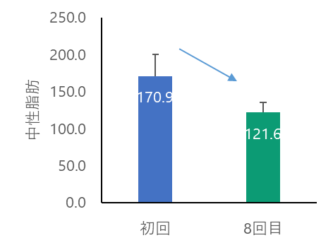 【調査結果3.】中性脂肪の減少血液検査による中性脂肪の測定においても、施術前後で平均49.3mg/dL減少し、有意な低下が認められました。筋肉には体内で脂肪を燃やす働きがあり、今回の結果はその働きが実際に数値として現れたものと考えられます。自覚症状だけでなく、血液検査という客観的な指標においても変化が確認されたことは、注目すべき点のひとつです。