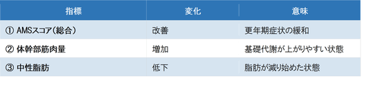 ■Dクリニック新宿 院長 鈴木医師コメント今回の調査では、AMSスコア・体幹筋肉量・中性脂肪という異なる3つの指標すべてに、統計学的に有意な改善が認められました。