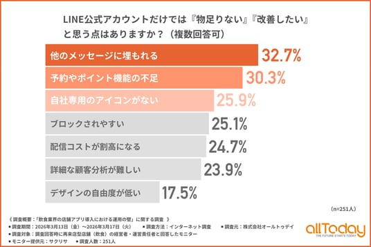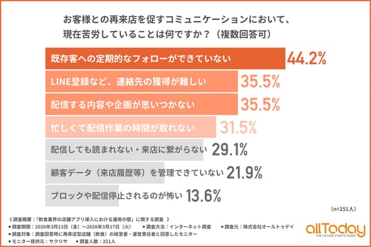 株式会社オールトゥデイ(本社所在地:埼玉県さいたま市)は、再来店型店舗(飲食)の経営者・運営責任者を対象に、「飲食業界の店舗アプリ導入における運用の壁」に関する調査を実施しましたので、その結果を公表します。