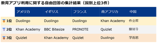 教育アプリ利用者を対象に、実際に利用しているアプリ名を具体的に尋ねました。得られた自由記述回答を国別で集計し、回答者数の多かったアプリ上位3つを抽出しました。以下では、上位に挙がったアプリの機能や特徴を解説します。