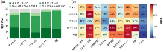 図1. (a)国別の教育アプリ利用頻度分布。縦軸は回答者の割合(%)を示し、各国のバーの色の違いによって、学習アプリの使用頻度の構成(「よく使っている」から「全く使ったことがない」まで)を表示しています。(b)国別およびアプリ種別の利用率を示したヒートマップ。各マスの数値は利用率(%)を示し、赤(高)~黄(中)~青(低)のカラースケールで項目のボリュームを視覚化しています。なお、算出母数からは「全く使ったことがない」層を除外しています。