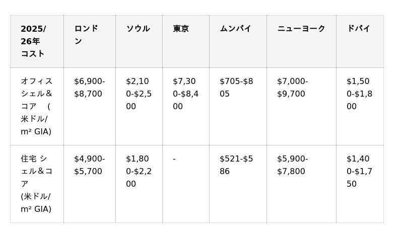 *コストデータの分析は、2026年第1四半期にターナー&タウンゼントによって実施され、コストの範囲は同社の実績データから算出されています。なお、本報告書は中東地域で最近発生した事象以前に取りまとめられており、それらに起因する潜在的な影響は反映されていません。