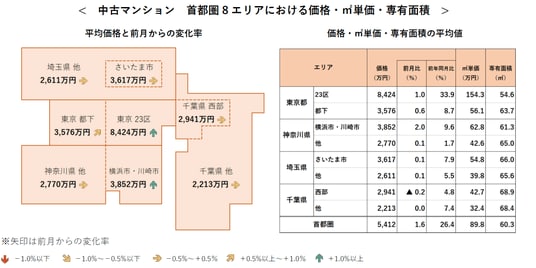 首都圏の1戸あたり平均価格は、前月比、前年同月比ともに上昇した。