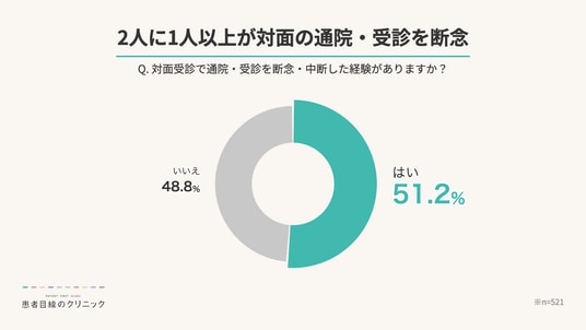 1.通院ドロップアウトの実態:移動時間・長い待ち時間をハードルに、2人に1人が通院を断念「対面受診で通院・受診を断念・中断した経験がありますか」とうかがうと、約2人に1人(51.2%)の方が「はい」と回答しています。