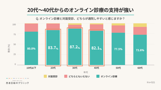 「オンライン診療と対面診療、どちらが通院しやすいと感じますか?」という問いに対しては、80.4%の方が「対面受診よりもオンライン診療のほうが通院しやすい」と回答しました。世代別に見ると、20代~40代が特にオンライン診療を支持していることがわかりました(20代:83.7%、30代:87.2%、40代:82.1%)。