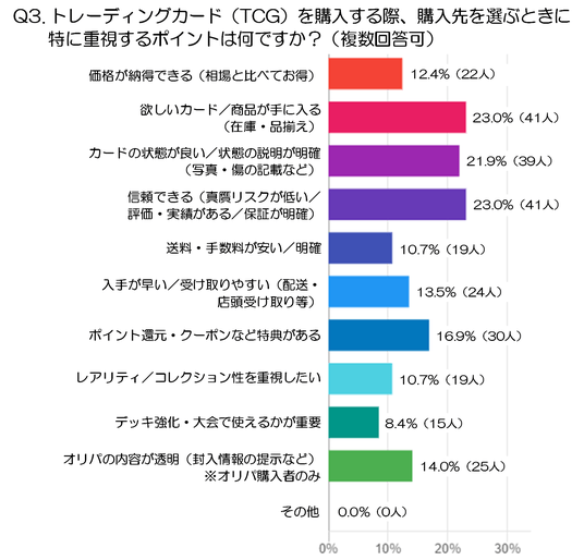 また、購入先を選ぶ際には「欲しいカードが手に入るか」「信頼できる販売元か」「カードの状態がしっかり確認できるか」といった点が重視される傾向が見られました。価格やポイント還元などのお得さも関心を集めていますが、それ以上に安心して購入できる環境や、必要なカードを確実に入手できることが重要視されている点が特徴的です。TCGはカードの状態や真贋が価値に直結するため、こうした要素を重視するユーザーが多いのも自然な流れと言えるでしょう。
