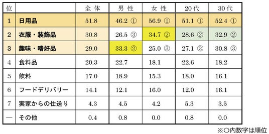 ◆「日用品」が51.8%でトップ、次いで「衣服・装飾品」「趣味・嗜好品」