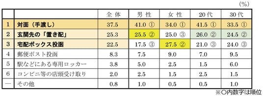 男女別では、男女ともに「対面」がトップであるものの、2位は男性が「玄関先での置き配」(25.5%)であるのに対して、女性は「宅配ボックス投函」(27.5%)をあげているのが特徴的です。