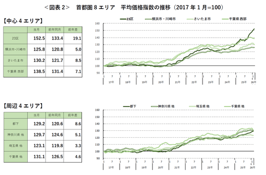 首都圏全体の平均価格は、前月比は横ばい、前年同月比は18カ月連続で上昇した。