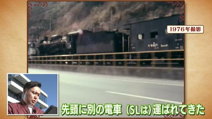 にむらあつとリポーターは、かつて駿府城公園にあった蒸気機関車を調査するために、1976年に撮影された映像を視聴。そこには蒸気機関車がさっそうと走る姿が映っていた。しかし、機関車が自走しているのではなく、別の電車にけん引されている。