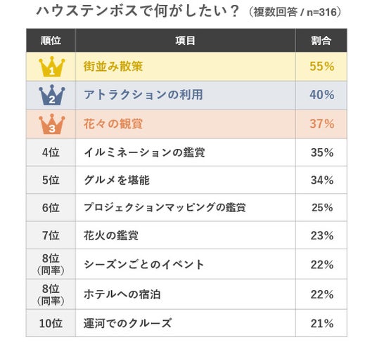 1位は「街並み散策」(55%)で、全体の半数以上の回答数を得る結果となりました。2位には「アトラクションの利用」(40%)、3位には「花々の鑑賞」(37%)がランクイン。4位は「イルミネーションの鑑賞」(35%)、5位は「グルメを堪能」(34%)と続き、ハウステンボスならではの景観や体験に幅広く関心が集まっていることがわかります。
