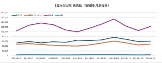 地域別では欧米豪からの検索が全体の半数を占めています。特に2025年10月に検索数が大幅に増加しました。季節要因として、奥日光・中禅寺湖~華厳の滝周辺で紅葉が見頃を迎えることに加え、イベント要因として日光東照宮・秋季大祭(毎年10/16-17)*3が開催されることも、検索数の増加に影響した可能性があります。海外向け観光情報でも定番化しており、イベント期に合わせた検索が伸びたと考えられます。