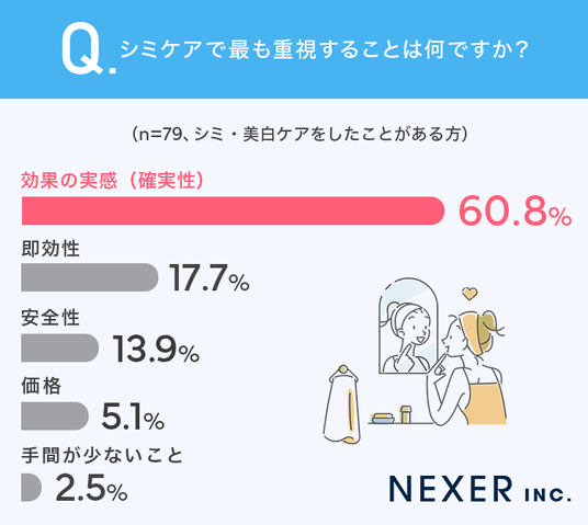 ■60.8%が、シミケアで最も重視するのは「効果の実感(確実性)」と回答