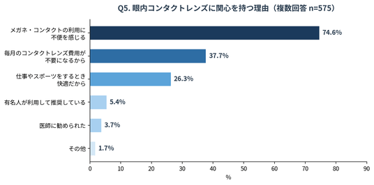 「メガネ・コンタクトの利用に不便を感じる」が74.6%で最多、次いで「毎月のコンタクトレンズ費用が不要になるから」が37.7%と、日常の不便さと経済的負担が主な関心の動機でした。
