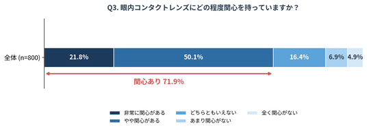 認知率(72.8%)と関心率(71.9%)がほぼ同水準であることから、眼内コンタクトレンズを知っている方のほとんどが、同時に治療への関心も持っていることが明らかになりました。
