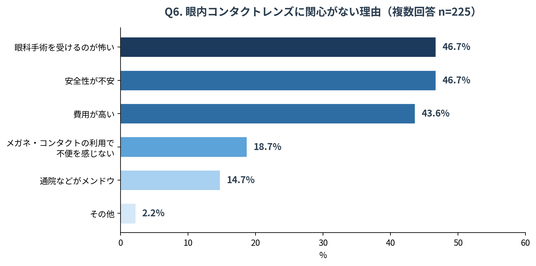 「眼科手術を受けるのが怖い」が46.7%、「安全性が不安」が46.7%と、手術に対する恐怖心と安全性への懸念が同率のトップでした。また「費用が高い」が43.6%と僅かな差で続いており、この3つが主要な阻害要因です。