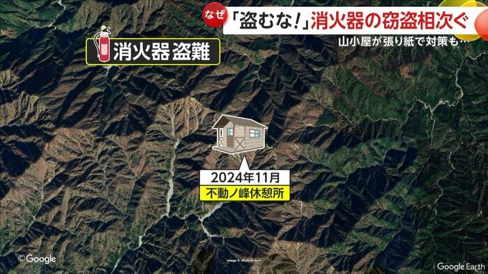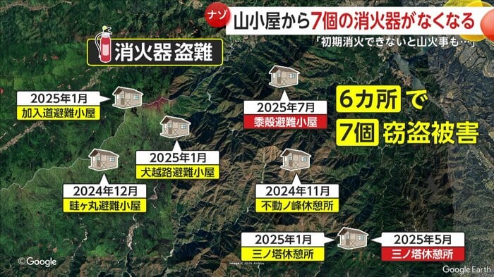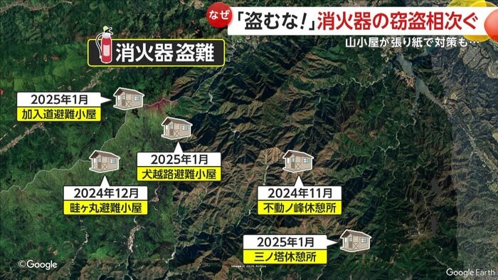 翌月には、最初の被害箇所から直線距離で約11km離れた畦ヶ丸の山小屋で、2025年1月には、三ノ塔の山小屋など3カ所で消火器がなくなっていたという。