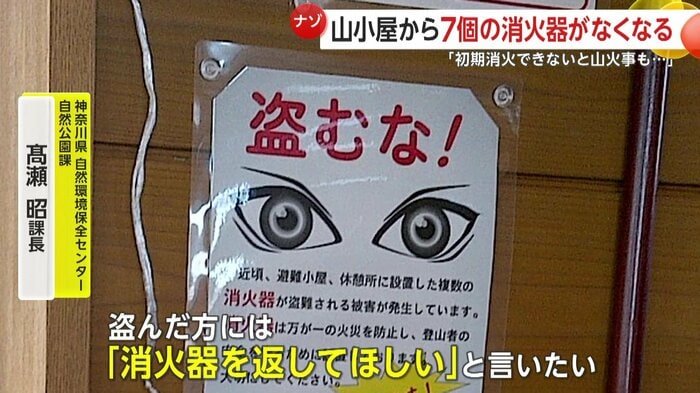 赤い文字で「盗むな!」と書かれ、ぎょろりとした目玉マークがにらみを利かせる、壁の貼り紙。神奈川県の山小屋で設置されていた消火器が、何者かに盗まれる被害が相次いでいる。