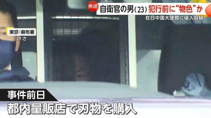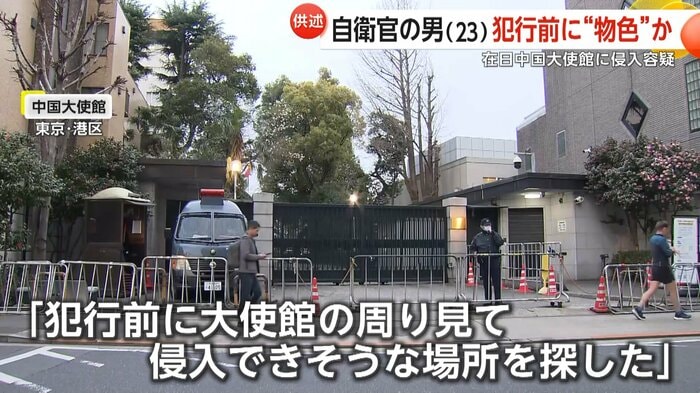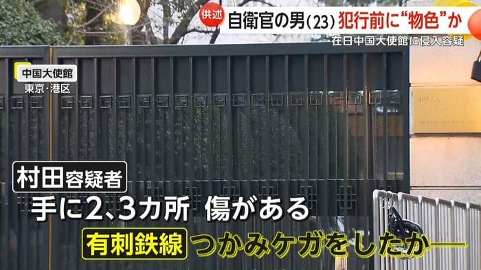 陸上自衛隊員の男が東京・港区の中国大使館に侵入したとして逮捕された。男は事前に周囲を下見し侵入場所を探していたと供述。隣接するビルから塀を乗り越えた際に有刺鉄線でけがをしたとみられ、前日には刃物も購入していたという。