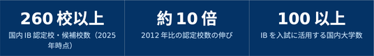 日本政府は「成長戦略 2021」(2021 年 6 月閣議決定)で IB 認定校・候補校を 200 校以上に増や す目標を掲げ、2023 年 3 月にその目標を達成しました。その後も増加の勢いは衰えず、2025 年時点 では認定校・候補校の合計が 260 校を超えています。