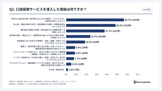 口座振替サービスを導入した理由について、最も多かった回答は「毎月の入金消込作業(誰が振り込んだかの確認・システム入力)の負担を減らしたかった」(56.7%)でした。次いで「未入金・滞納の発生を防ぎ、督促業務の心理的・時間的負担をなくしたかった」(48.5%)となっており、経理担当者の目視確認や督促業務にかかる工数削減が、口座振替サービス導入の主な動機となっていることがわかります。