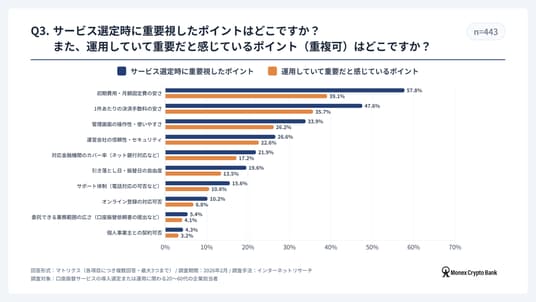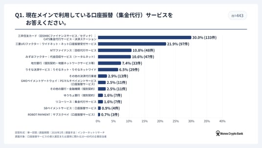 マネックスクリプトバンク株式会社(本社:東京都港区、代表取締役社長:万代惇史、以下「マネックスクリプトバンク」)は、口座振替サービスの導入選定または運用に関わる20~60代の企業担当者443名を対象に、2026年2月に「口座振替サービス利用実態調査」を実施いたしました。 本調査では、口座振替サービスの市場シェア、導入の背景、および運用における課題など、企業の口座振替サービスに関する利用実態を調査しています。