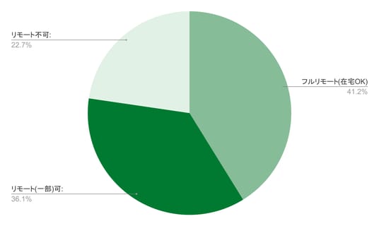 SOKUDANに掲載されているC#エンジニア案件は、フルリモートが41.2%、一部リモート可を含めると77.3%がリモート対応可能です。ただし、リモート不可も22.7%と他のエンジニア職種に比べて高めの割合です。