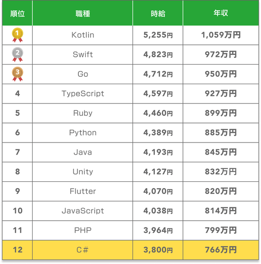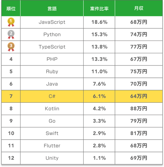 一方で、競合が少ない分、C#の実務経験があれば案件獲得の難易度は高くありません。Unityを使ったゲーム開発や、.NET MAUIによるクロスプラットフォーム開発など、活躍領域を広げることで選択肢を増やすことも可能です。