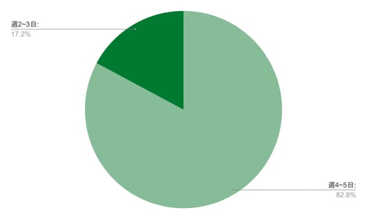 SOKUDANに掲載されているC#エンジニア案件は、週4~5日が82.8%と圧倒的にフルタイム稼働が中心です。週2~3日は17.2%にとどまり、柔軟性は限定的といえます。