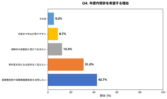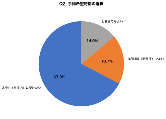 約7割が年度内の手術を希望しており、駆け込み需要の高さが明らかになりました。年度内に医療費を確定させたいという意識や、新年度を気になる症状なく迎えたいという心理が影響していると推測されます。
