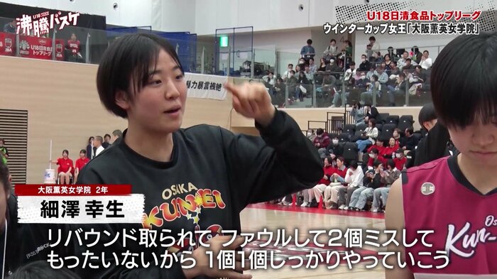通常のリーグ戦と異なり昇格と残留をかけた⼀発勝負の戦い。女子の注目は、去年のウインターカップで悲願の初優勝を飾り、ブロックリーグは全勝優勝、トップリーグ返り咲きを狙う大阪薫英女学院。県立湯沢翔北(秋田県)と対戦した1回戦は62点差をつけ難なく突破するも、その試合で細澤幸生(こおせ)が足を痛め負傷交代。(U16アジアカップでキャプテンを務めた)チームのエースを欠いた状態で、運命の2回戦に臨むこととなった冬の女王。