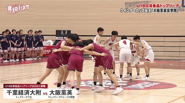 2回戦の相手はトップリーグ7位で入替戦に臨むことになった千葉経済大学附属高校(千葉)。勝てばトップリーグ参戦となる一戦は一進一退の攻防に。第2クオーターを終えた時点で、大阪薫英が1点をリードします。ハーフタイムには怪我で試合に出られないエースが冷静にディフェンスの改善点を指摘します。
