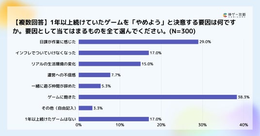 続いて「日課が作業に感じた(29.0%)」「インフレでついていけなくなった(17.0%)」が挙がり、マンネリ化や難易度バランスが影響していることがうかがえます。