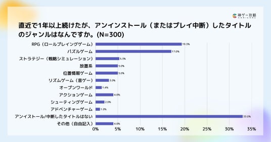 1年以上続けた後に離脱したゲームのジャンルでは、「RPG(19.3%)」が最多、次に「パズルゲーム(17.0%)」が続きました。