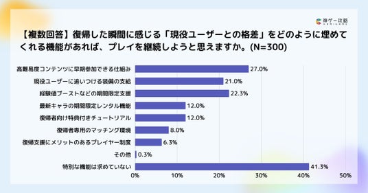 復帰後に求める機能では「高難易度コンテンツに一気に到達できる権利(27.0%)」が最多でした。