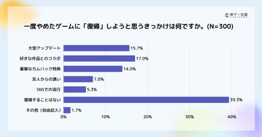 ゲームへの復帰のきっかけについては「好きな作品とのコラボ(17.0%)」「大型アップデート(15.7%)」が上位でした。