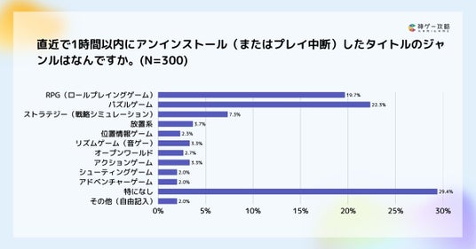 直近で1時間以内に離脱したタイトルのジャンルでは、「パズルゲーム(22.3%)」と「RPG(19.7%)」が上位を占め、3位の「ストラテジー(7.3%)」とは一定の差が見られました。
