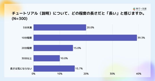 チュートリアルが長いと感じる程度については「10分程度」で長いと感じる人が39.3%で最多となりました。 「5分未満(20.0%)」と合わせると、約6割が10分以内で長いと感じていることになります。