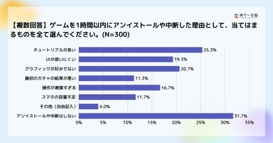 ゲームを1時間以内にやめた理由では「チュートリアルが長い(25.3%)」が最多でした。
